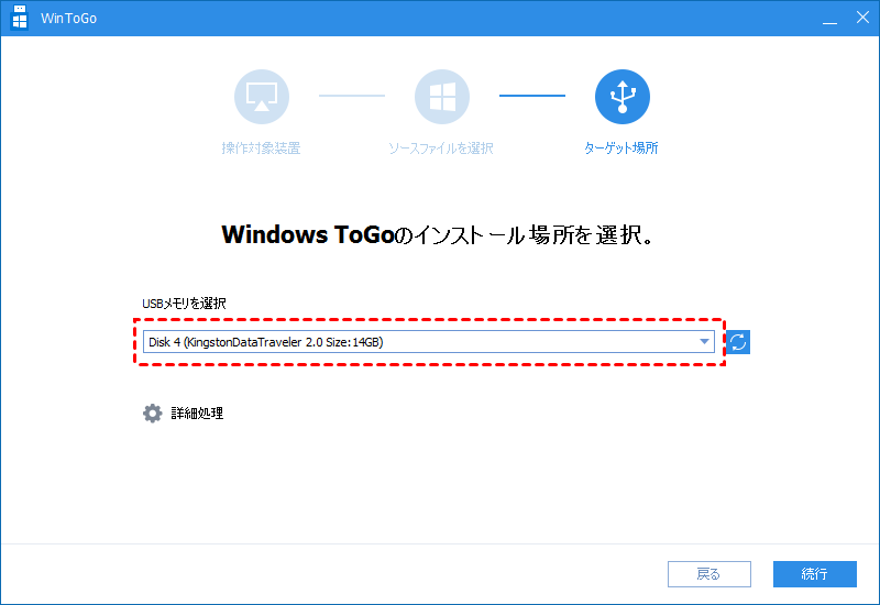 - USB フラッシュドライブを選択し、「次へ」をクリックします。