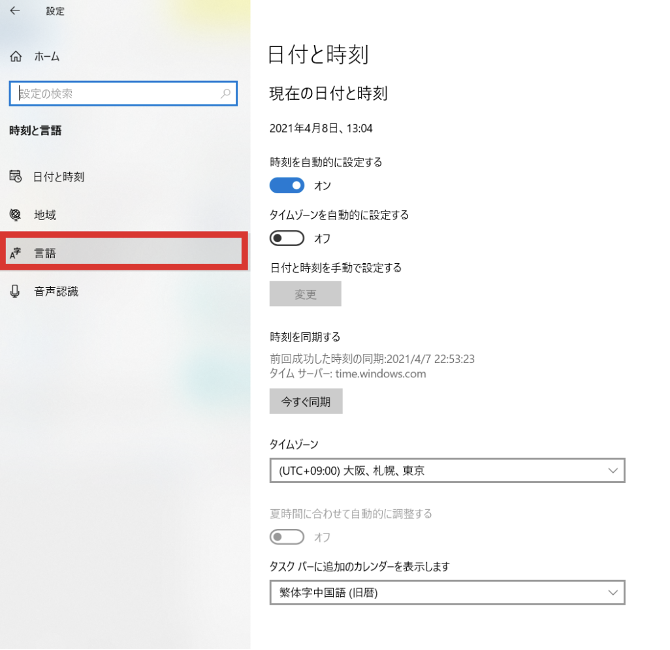 - 言語バーの設定が正しくない場合は、設定 > 地域と言語で修正します。