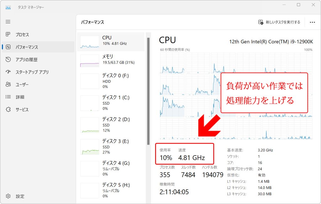 - 動作周波数:CPUの動作周波数を動的に調整し、パフォーマンスと電力消費のバランスを取る。