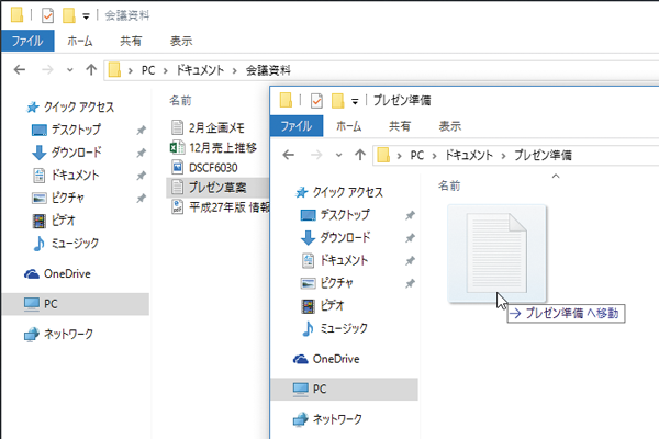 - ファイルをフォルダにドロップすることで、ファイルが移動されます。