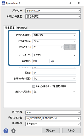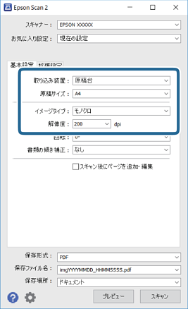 基本設定 スキャンモード、解像度、保存形式、ファイル名と保存先を設定します。