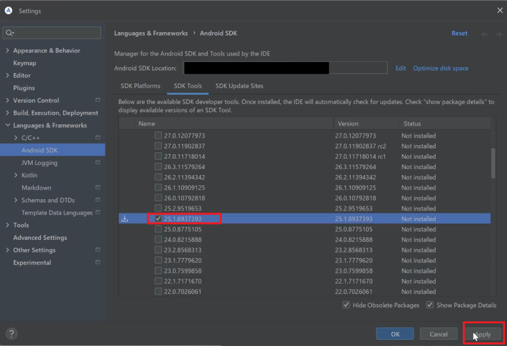 - Android NDK Locationセクションで、NDKのディレクトリが表示されます。NDKがインストールされていない場合は、このセクションからインストールすることができます。