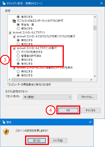 - [カスタムレベル] 設定で [プロンプトする] を選択することで、ActiveXコントロールの実行前に警告メッセージが表示されます。これにより、ユーザーが実行するかどうかを選択できます。