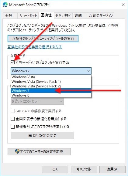 - 互換性タブの使用: 問題が発生するアプリケーションのプロパティを開き、「互換性」タブで「このプログラムは他のWindowsバージョンで設計されました」にチェックを入れ、Windows7を選択します。