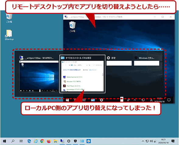 - リモートデスクトップセッション中、Altキーを押しながらTabキーを押します。