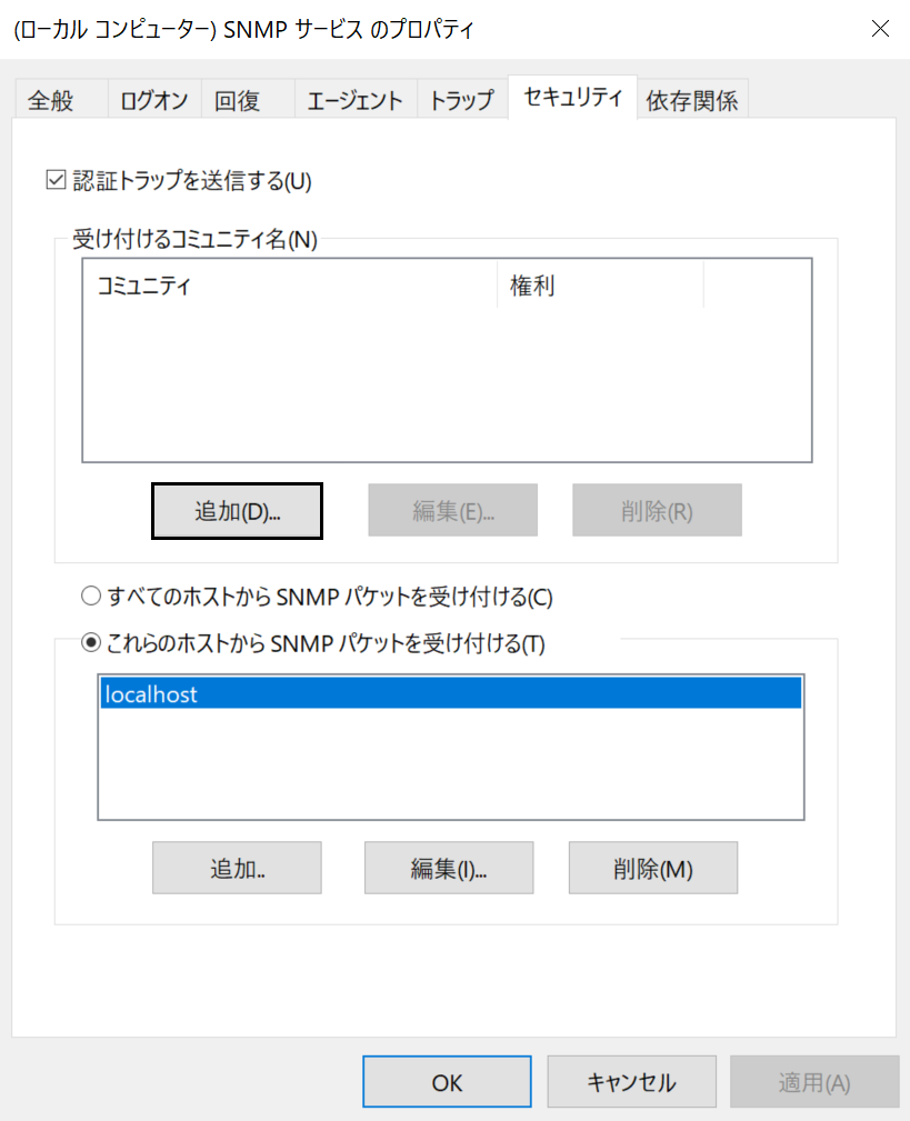 - セキュリティタブでコミュニティ名とアクセス許可を設定します。