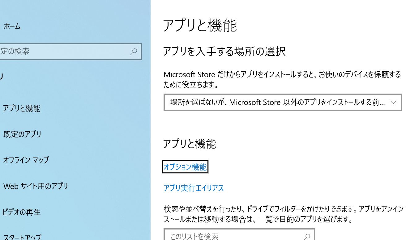 - 「アプリ」を選択し、「オプションの機能」をクリックします。
