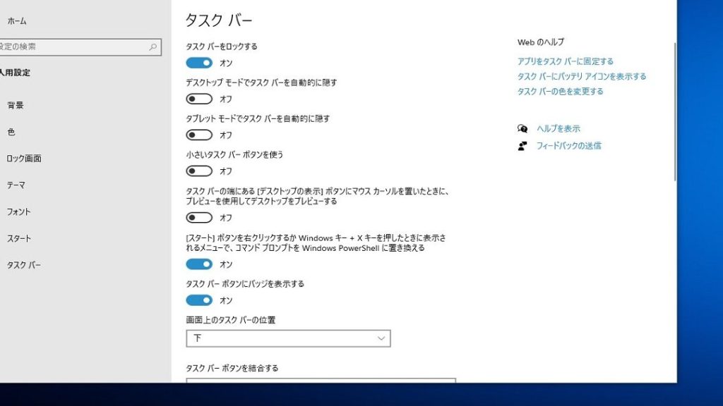 3. ここから、タスクバーの位置、自動隠し、アイコンのサイズなどを変更できます。