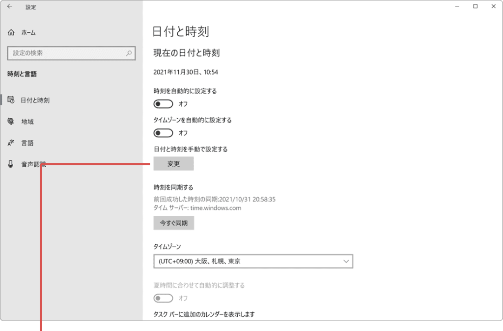 - 誤っている場合は、「変更」ボタンをクリックし、正しい日付と時刻を設定します。