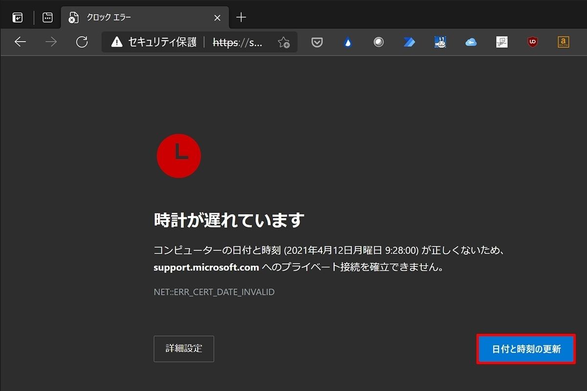 - 誤っている場合は、正しい日付と時刻に修正し、設定を保存してPCを再起動します。