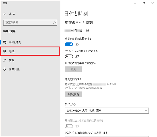 3. 左側のメニューから「地域」を選択し、追加設定をクリックします。