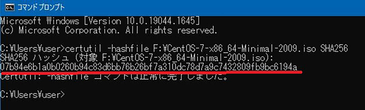 4. 実行後、ハッシュ値が表示されます。この値を提供元のチェックサムと比較して、ファイルの整合性を確認します。