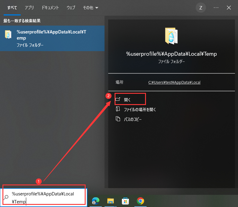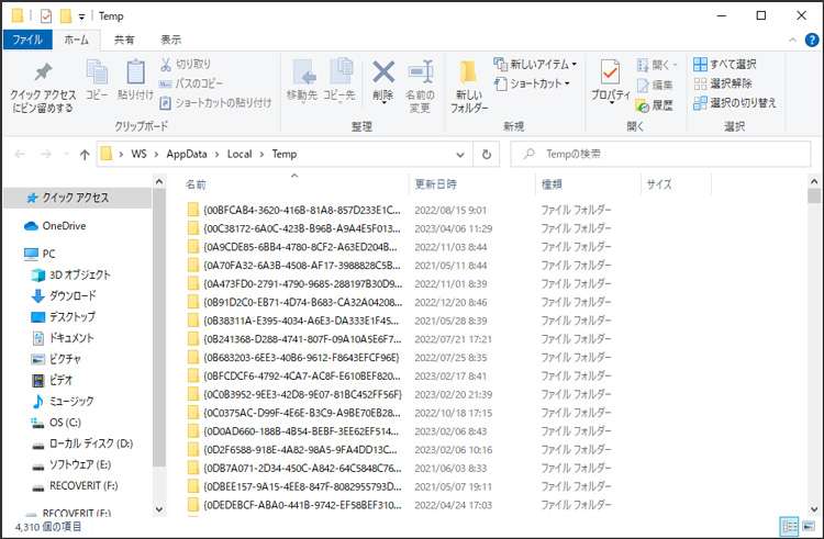 - ファイルエクスプローラーを開き、「%temp%」と入力してEnterキーを押します。