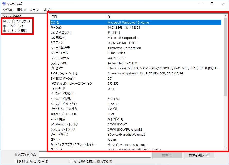 - OS名:操作しているWindowsのバージョンを確認できます。