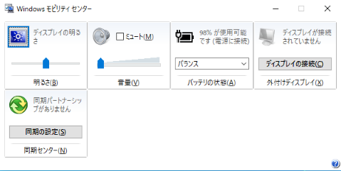 モビリティセンターは、Windows 10の便利なツールで、バッテリー、ディスプレイ、サウンドなどの設定を一箇所で管理できます。まず、タスクバーの アクション センターをクリックし、「モビリティ センター」を選択します。または、検索ボックスに「モビリティ センター」と入力し、表示される結果からクリックして開くことができます。