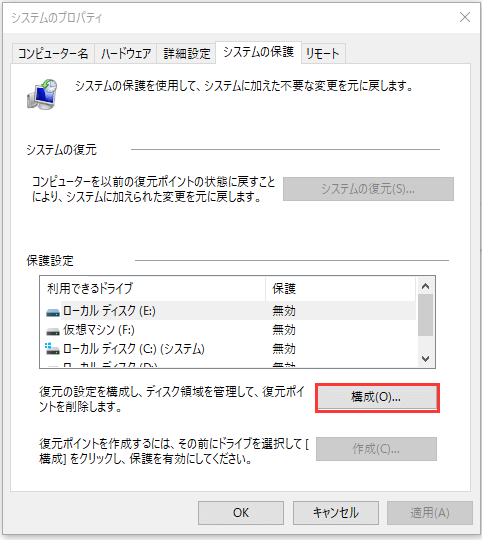 - システム保護: 「システム保護」をクリックし、必要に応じて各ドライブの保護を有効にしたり、使用可能なディスクの空き領域の割合を設定したりします。