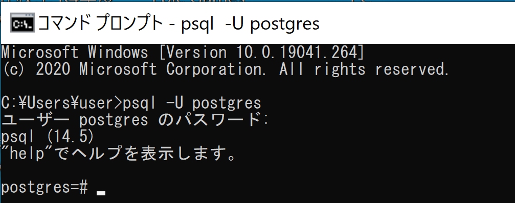インストールが完了したら、コマンドプロンプトまたはPowerShellを開きます。次に、以下のコマンドを実行してpsqlコマンドラインツールを起動します。