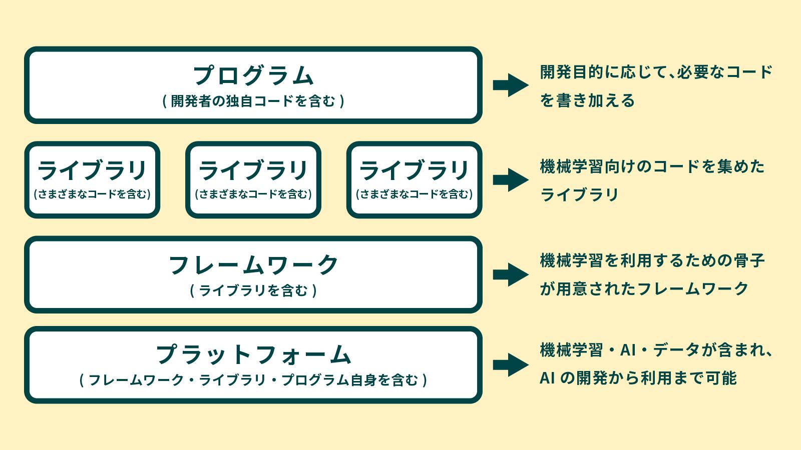 ディープラーニングのフレームワークとは、ディープラーニングモデルの開発と学習を効率化するためのツールやライブラリの集合体です。これらのフレームワークは、神経망の層を簡単に定義し、データの前処理や最適化アルゴリズムの適用、モデルの評価を行うための様々な機能を提供しています。開発者はこれらのフレームワークを使用することで、複雑なディープラーニングモデルを短時間で構築し、実装することができます。代表的なディープラーニングフレームワークにはTensorFlow、PyTorch、Kerasなどがあります。