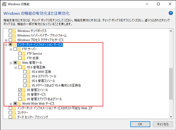- インターネット情報サービス (IIS)を展開し、必要な機能をチェックマークで有効にします。