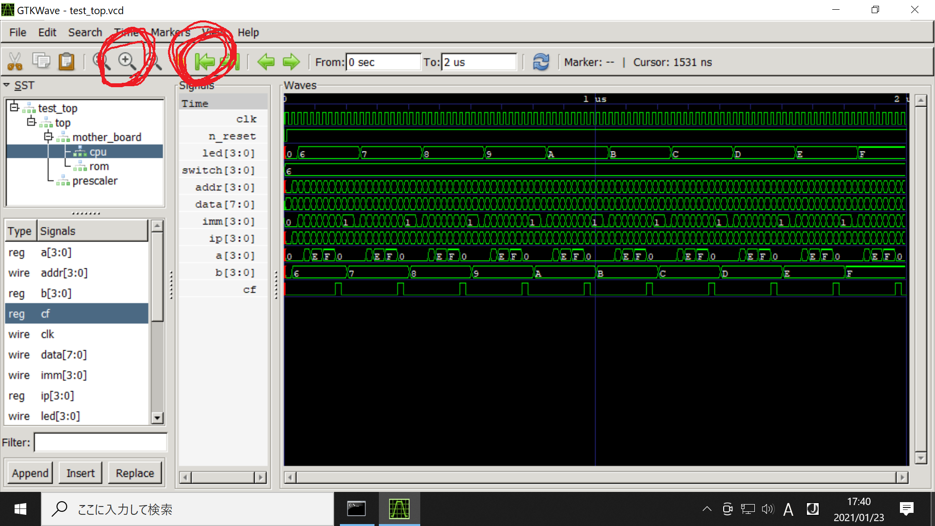 4. gtkwave波形を表示し、シミュレーション結果を確認します。
